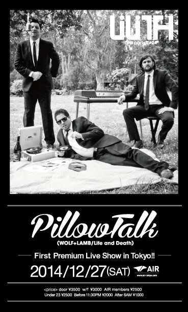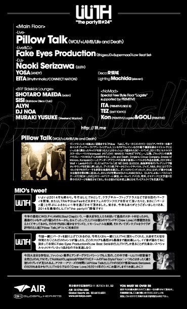 良質なアーティストをフィーチュアしながらダンスミュージックファンに熱く支持されてきた“LiLiTH”は、この夜24回目の開催を迎える。メインアクトに登場するのは、これが日本初上陸となるサンフランシスコの楽しみなユニットだ。ヴォーカリストSammy D、ピアノやギター担当のマルチプレイヤーRyan Williams、シンセ・ドラムマシーン等を操るMichael TelloからなるPILLOW TALKは、2011年のデビュー以来、“LiLiTH”と深いつながりのあるWOLF+LAMBを始めとしたレーベルから話題作のリリースを重ねてきた3ピースバンドである。彼らが東京で初めて魅せるライヴ&DJセットは、まさに必見といえよう。