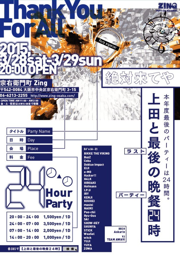 大阪の大御所はもちろん、全国から滅多に揃う事の無い豪華メンバーが3/28-29に宗右衛門町Zingに集結します。この日は時間ノンストップミュージック