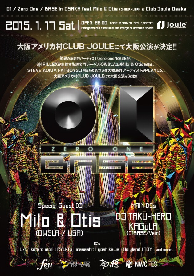驚異の革新的パーティ01 / zero one / BASE が、SKRILLEX が主催する超名門レーベルOWSLAよりMilo & Otisを迎え、STEVE AOKIや、FATBOYSLIM などの名立たる大物海外アーティストがPLAYした、大阪アメリカ村 CLUB JOULEにて大阪公演が決定 !!