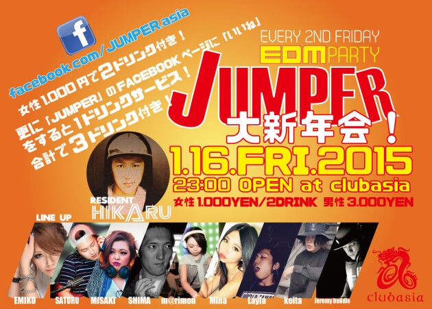 毎月第二金曜日、clubasiaが満員激モリになる女性無料(1000yen/2drink tickets)のEDMパーティー「JUMPER」