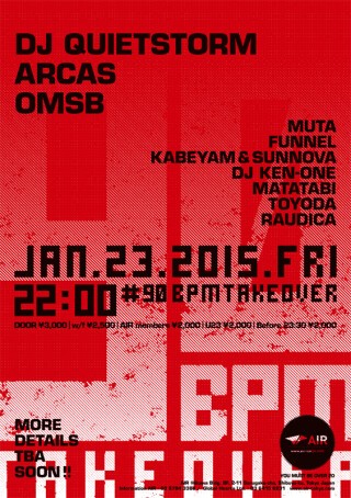 ヒップホップをルーツに深化を続けるビートミュージックシーンのキーパーソンたちが集結し、堂々のパフォーマンスを繰り広げる“90BPM TAKEOVER”。ふだんはウィークデイが舞台となるこのパーティの、初の週末開催が決定した。特別な夜にフィーチュアされたゲストは、TADASHI YABEとの新ユニットRightousで先月AIRを沸かせたDJ QUIETSTORMと、福岡を拠点に活動する独創的ビートメイカー/DJ ARCAS。そして、11月にリリースしたばかりの自身のソロアルバム「OMBS」が大きな話題を呼んでいるOMSBといった魅惑のア―ティストたちだ。熱い盛りあがりが約束された一夜が、いま幕を開ける。