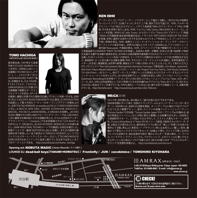 KEN ISHII, TOMO HACHIGA(NEOTOKYO.LAB/SOLSTICE MUSIC ), ME:CA(INDIGO TRIBE)