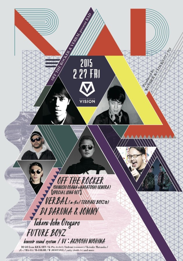 大沢伸一と上村真俊によるDJユニット、OFF THE ROCKER。そして音楽~ファッション界に至るまで幅広く活躍する21世紀型マルチ・アーティスト、VERBAL。この両者によるイベント『RAD』が、いよいよ2015年第一弾の開催を迎える。今回もこれまで同様、OFF THE ROCKERとVERBALが立つDJブースの周囲を来場者に開放。出演者とクラウドが一緒になり、そこにしかない空間と時間を組み立てていく。さらに、ゲストアーティストとしてDJ DARUMA & JOMMYが初出演。音楽性のみならず、パーティの価値をレベルアップさせるべく、挑戦的なスタイルを掲げる『RAD』。そのエキサイティングでカオスなエネルギーがさらに威力を増す!!!