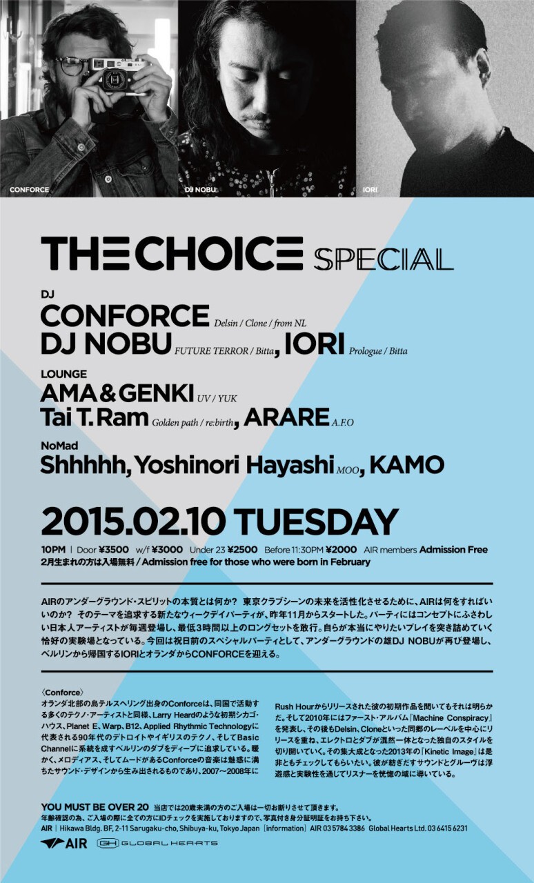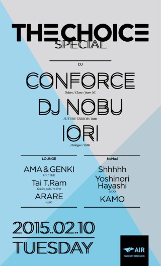 AIRのアンダーグラウンド・スピリットの本質を純粋に突き詰めるために、火曜日の夜を舞台に昨年スタートしたパーティ“THE CHOICE”。祝前日開催となる今回は、初の海外ゲストをフィーチュアするスペシャルヴァージョンだ。オランダより飛来するConforceは、初期シカゴハウスやデトロイトテクノ、90年代のUKテクノ等にインスパイアされた幅広い音楽性を武器とする、魅惑のプレイを披露。これを東京アンダーグラウンド・ダンスミュージックシーンの雄DJ NOBUと、現在ベルリンを拠点に欧州各都市のギグで活躍中のIORIが迎え撃つ。ここで、AIRのアイデンティティをリアルに体感してほしい。