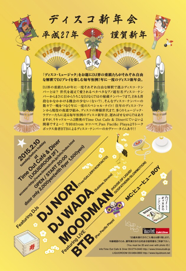 DJ界の重鎮たちが年に一度それぞれ自由な解釈で選ぶディスコ・ナンバーとは? 世代を超えて愛されるベタベタなアノ超有名ディスコ・ナンバーからまさに目からうろこなDJならではの秘蔵ナンバー?まで。どれも普段なかなかかける機会の少ない(ない?)、そんなディスコ・ナンバーの数々で一晩をつなぐ年に一度のスペシャル・ナイト! 往年のディスコ・ファンから現役の夜遊び組み、ディスコの神様世代まで、多くのミュージック・ラヴァーたちに送る毎年恒例のディスコ新年会、遅ればせながらではありますが、リキッドルーム2階奥のTime Out Cafe & Dinerにていよいよ開幕ですよー! 今回はfrom ヨコハマ、Pan Pacific Playaよりトークボックス奏者BTBによるディスコ・ナンバーのカヴァー・タイムあり!!