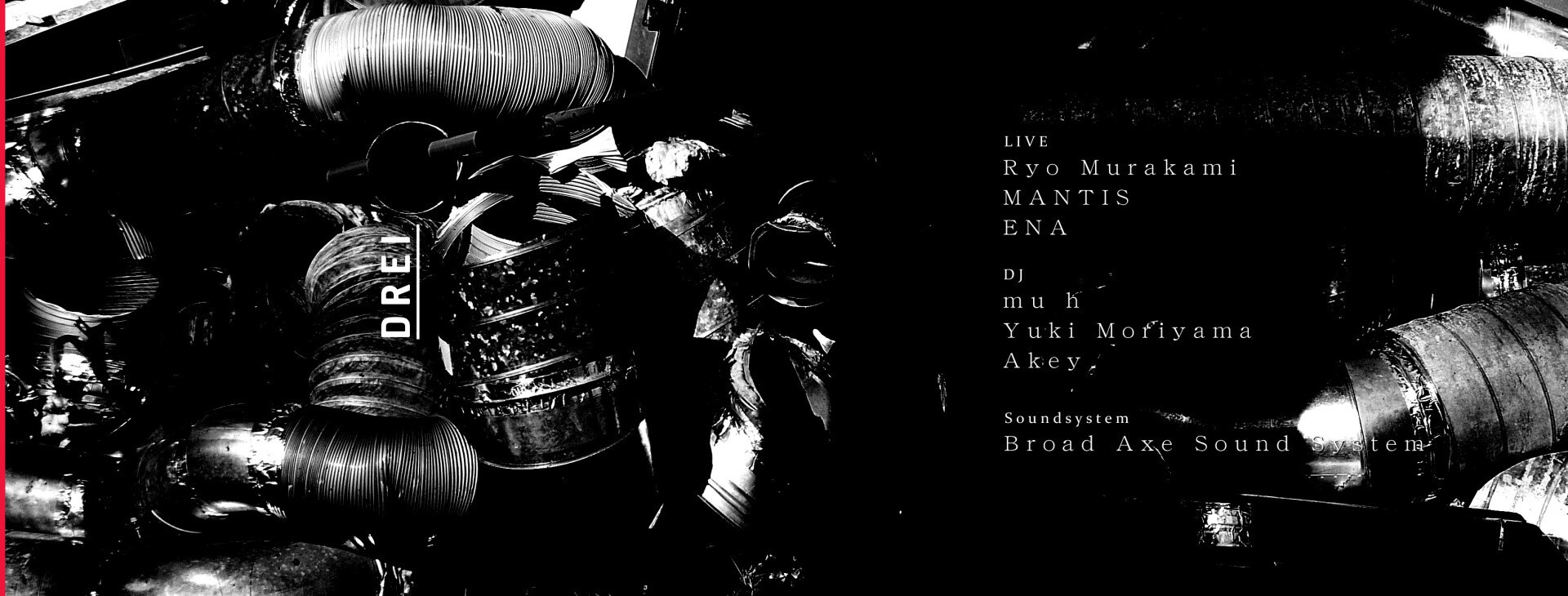 Bedouinよりセカンドアルバムのリリースも控えるRYO MURAKAMI、異能が集うレーベルBLACK SMOKER RECORDSよりリリースされたCollapsizmが話題のMANTIS、セカンドアルバムBinauralが世界的評価を得たENA、日本で有数な低音/音響にこだわりを持つこの3組が集結し、Broad Axe Sound Systemのスピーカーより各々のこだわりの音を鳴らす。