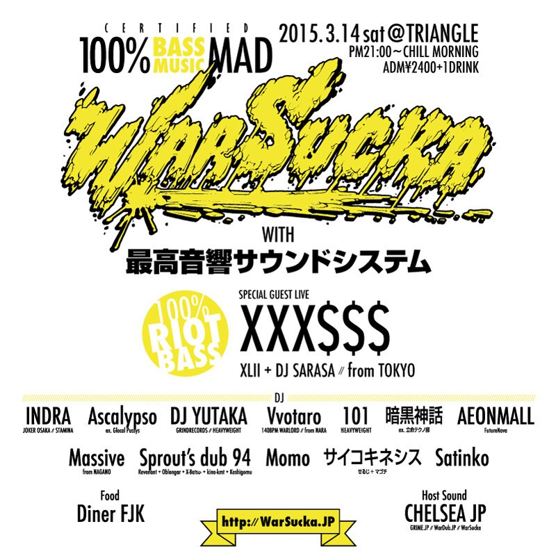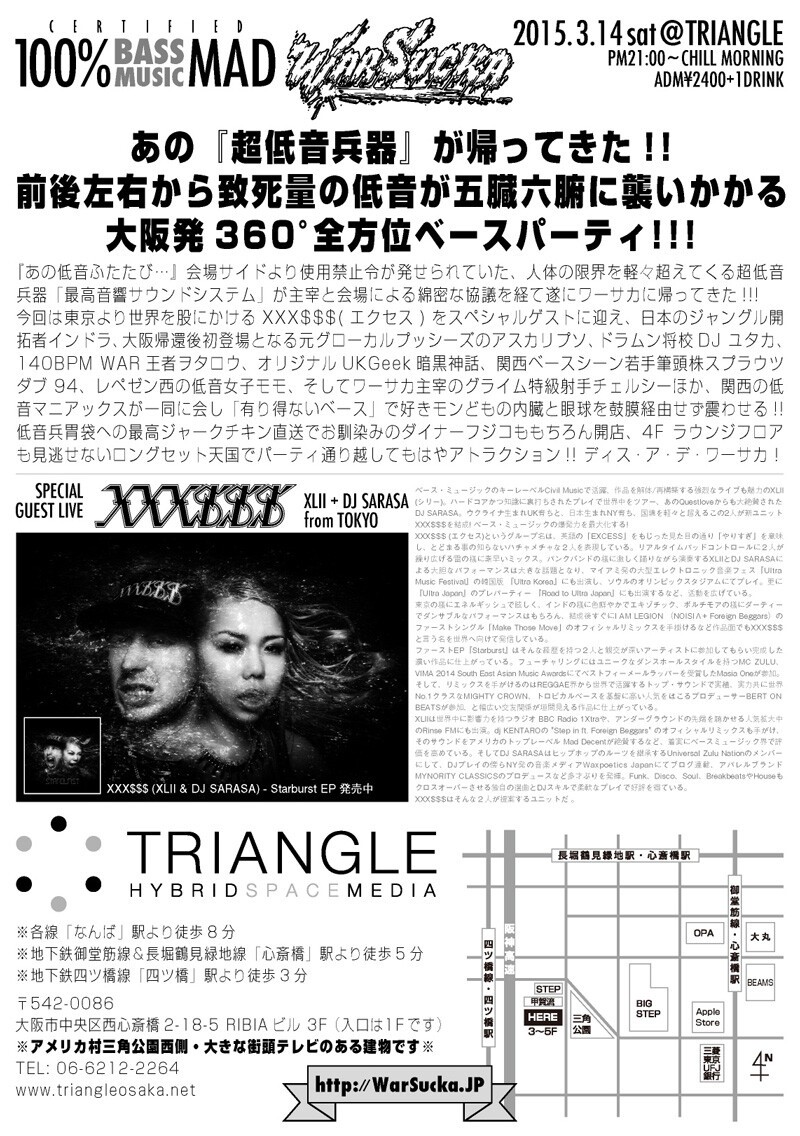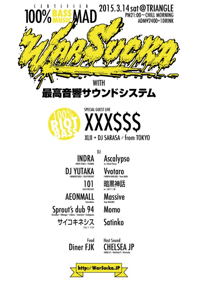 今回は東京より世界を股にかけるXXX$$$(エクセス)をスペシャルゲストに迎え、日本のジャングル開拓者インドラ、大阪帰還後初登場となる元グローカルプッシーズのアスカリプソ、ドラムン将校DJ ユタカ、140BPM WAR王者ヲタロウ、オリジナルUKGeek暗黒神話、関西ベースシーン若手筆頭株スプラウツダブ94、レペゼン西の低音女子モモ、そしてワーサカ主宰のグライム特級射手チェルシーほか、関西の低音マニアックスが一同に会し「有り得ないベース」で好きモンどもの内臓と眼球を鼓膜経由せず震わせる!!