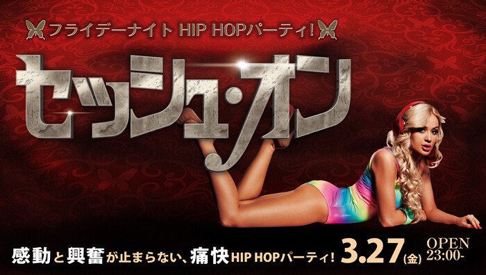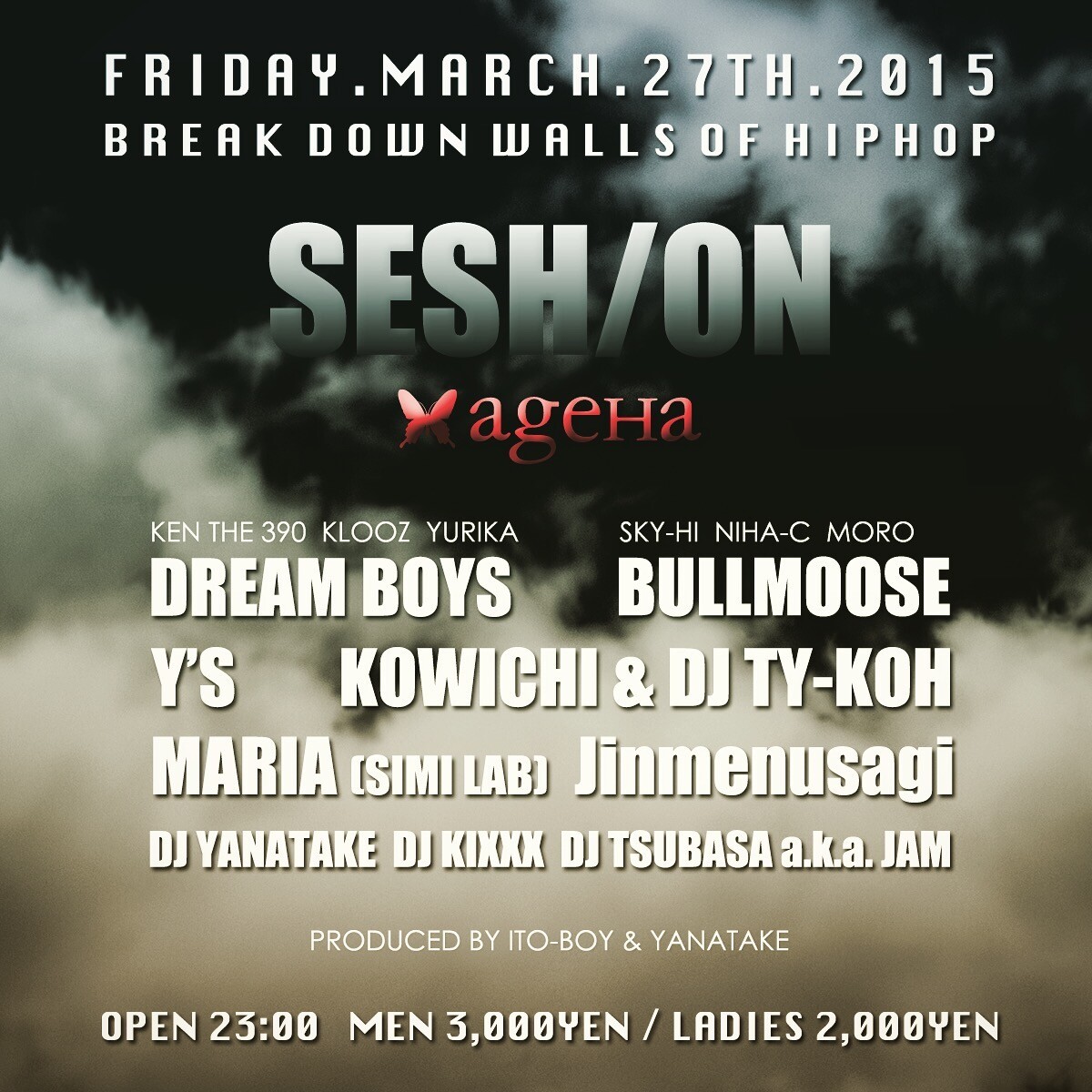 ageHaフライデーのHIP HOP PARTYはJAPANESE HIP HOPシーンの第一線で活躍するアーティスト達が集い、異空間へと導くニューパーティ「SESH/ON」を開催。
