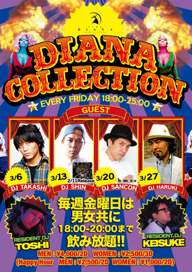毎 週1000人以上のお客様で賑わう看板モンスターパーティー・DIANA COLLECTIONは「誰でも楽しめる」をテーマに最新のヒット曲中心に、クラブ初心者の方でも安心して遊んで頂けるようにスタッフ一同心よりおもてな し致します。女性一人でも来店しやすいと安心感があって評判なCLUB DIANA。金曜日は名物の大スクリーンでVJ映像やMusicPVを楽しむもよし、マスコミにも取り上げられたスーパーお立ち台「DIANA RUNWAY」で優雅に踊るもよし。皆で乾杯できるFree Tequila Timeもあって、多くの人で賑わい、ラグジュアリー感溢れるCLUB DIANAのFRIDAY NIGHTにいつもよりちょっとオシャレしてご来店下さい・・・この日はホワイトデースペシャルで開催します!