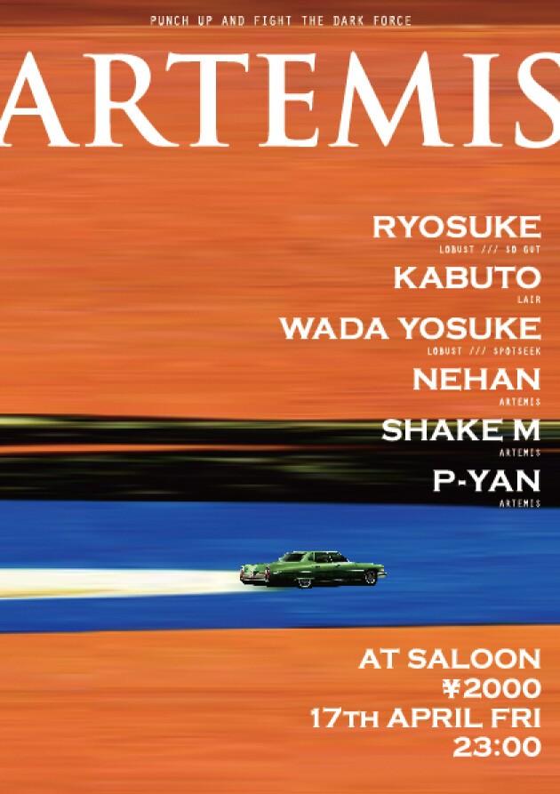 Jan Krueger、Lowtec、Vincent Lemieux等、厳選されたゲストと共に数々のドラマをみせる"ARTEMIS"。揺れる地下3階、Saloon単独開催となる今回はARTEMISと深い所縁のあるRyosuke、Kabuto、Wada Yosukeの3人のDJをフィーチャーしお届け!ド悪でイカれたサウンド、タフでエッジが効いたグルーヴと共にこの夜を深く彩る主人公はクラウド一人一人。PUNCH UP AND FIGHT THE DARK FORCE...!