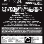 FLOOR LINE UPには、スクラッチ、2枚使いを交えた独特のELECTRO/DISCOミックスで定評のあるDJ、PRODUCE WORKでも活動中の副島ショーゴ、縦ノリを追求した雑食Technoを響かせるFumihiko Chiba、説明不要のモンスターバンドDragon AshからSAKURAI MAKOTO、block.fmや都内各パーティーで大・大・大活躍中のTakeru John Otoguro、彼らを中心に、今最も旬なDJ陣が渋谷clubasiaに集結。