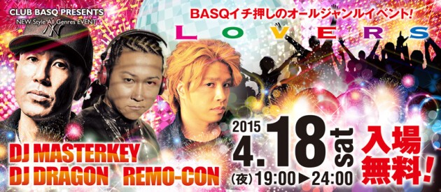CLUB BASQ,いち押しプッシュ、プッシュ!!のイベント『LOVERS』!! 県内外の最強DJ陣が、エッジの効いた選曲で土曜の夜をロック!! また、世界、そして日本国内で活躍中のDJ MASTERKEY/DJ DRAGON/DJ Remo-con」がそれぞれ、MASH UPしたトラックを使いフロアを最高調に誘います。スペシャルイベント『LOVERS』!! なんと入場は、無料!! 是非お待ちしております。