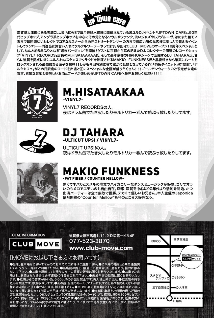 滋賀県大津市にある老舗CLUB MOVEで毎月最終水曜日に開催されている激ユルDJイベント「UPTOWN CAFE」。