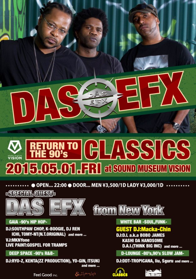 「ヒップホップの黄金期」と称される90年代にフォーカスし、毎回レジェンド級のアーティストをフィーチュアして開催される“CLASSICS”。それは、凄まじいほどのオーディエンス動員とフロアの高い熱気を誇る、VISIONを代表するパーティの一つだ。今回のヘッドライナーを務めるのはDAS EFX。EPMDが束ねるHit Squad所属のデュオであり、ヴァージニア出身のラップ・アクトとして最初にゴールドディスクを獲得したグループである。その魅力は言葉遊び中心の「ディギディスタイル」と呼ばれるラップで、巻き舌で多くの韻を踏むパフォーマンスは90年代に一世を風靡するトレンドとなった。そんな時代の興奮を、リアルに体感する一夜へ。
