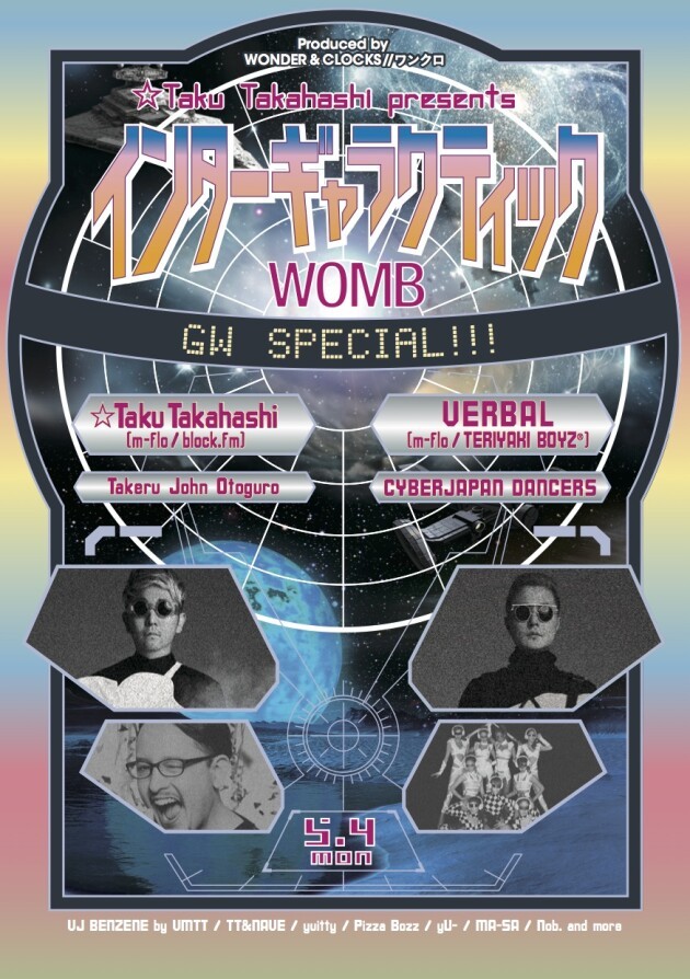 Last time, YOJI BIOMEHANIKA and 80KIDZ stopped by to help Taku Takashi celebrate his birthday. To keep the enthusiasm going, Taku Takahashi is going to put on an intergalactic event the likes of which you've never seen! The event will be held on May 4th, and for the first time since March of last year, partner-in-crime VERBAL will be on the scene! The two great men of m-flo will also put on an exciting performance. In addition to the latest set by the mixer of m-flo's hit, Taku Takahashi, and an aggressive performance by VERBAL, guests may be in for an intergalactic surprise! Familiar members Takeru John Otogura and the CYBERJAPAN DANCERS will also be in the house. Step into a meteor shower of music brought to you by extravagant artists, with Taku Takahashi and VERBAL in the lead!