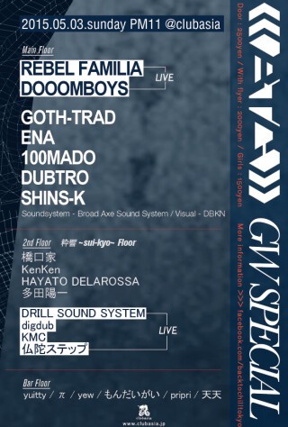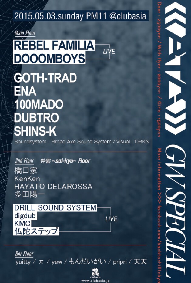 UK Dubstepシーンの最重要レーベルDeep MediからのリリースやRebel Familiaとしての人気も高いGoth-Tradを筆頭に、DJたちが織り成すオリジナル「DUB」と古今東西の「ヤバい」音が鳴り響く一夜は、平日開催にも関わらず多くの動員を誇っている。