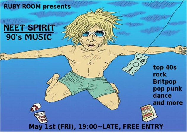 A natsukashi night with live music from 90’s influenced musicians who will perform a selection of original songs and some covers of their favorite nineties tunes. DJs play a variety of genres: top 40 pop hits to grungie alt rock, Brit-pop, pop punk and the odd dance track to get ya moving!