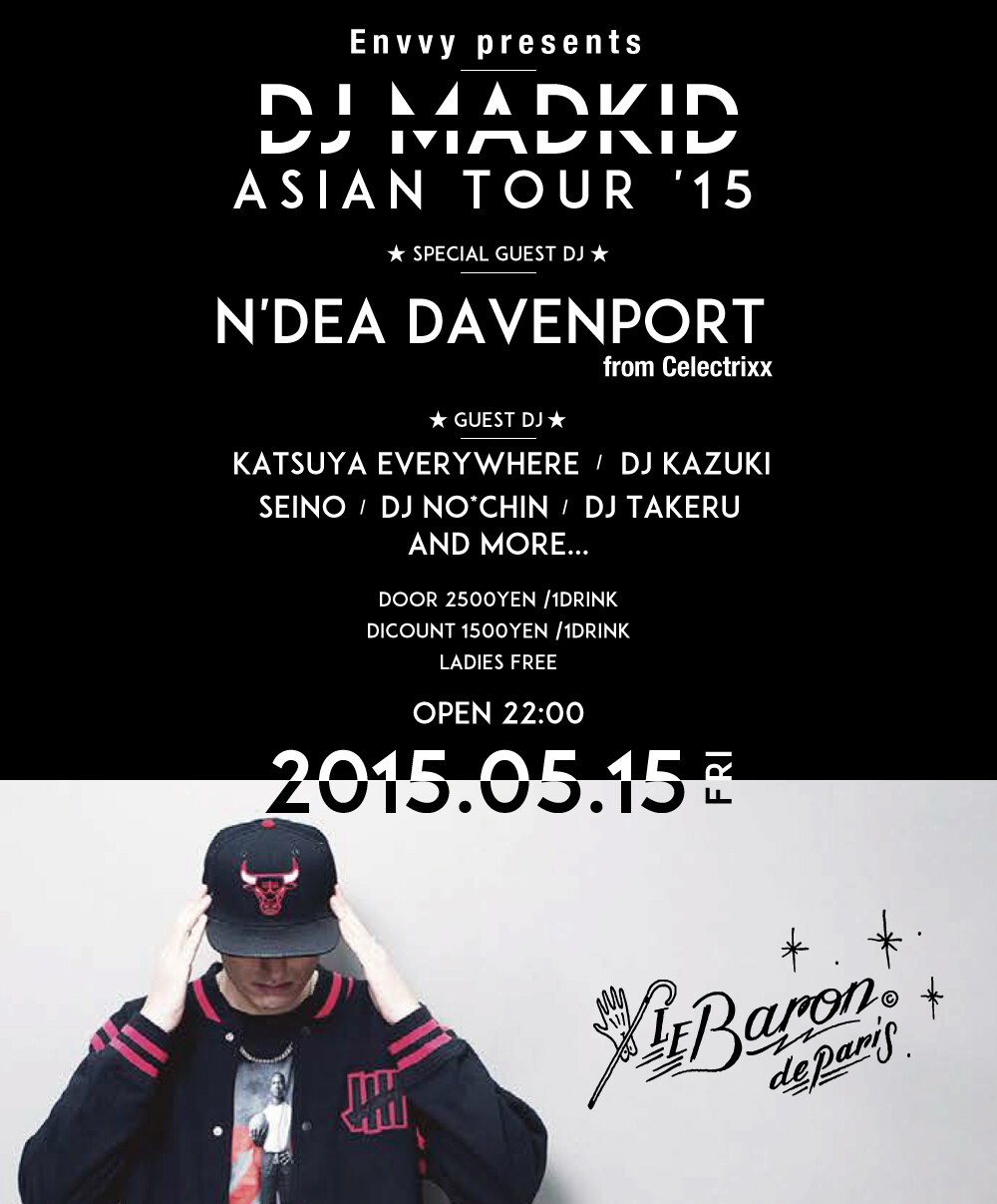 Envvy presents DJ MADKID Asian Tour ’15は、スイスから常に新しいビートを模索するDJ MADKIDを迎えルバロンで開催します。ゲストミュージックセレクターにはCelectrixxから歌姫N’dea DavenportとKATSUYA EVERYWHEREを迎え、個性豊かなメンバーが集います。
