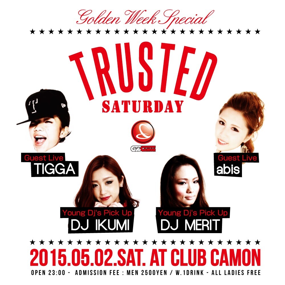 【毎週土曜トラサタ】土曜カモンは『TRUSTED SATURDAY』☆☆大阪を代表するHIP HOPアーティストによるALL BLACK MUSIC PARTY★★女性は終日入場無料☆☆CLUB CAMONのLINE公式アカウント登録で割引特典あり☆☆お得な終日飲み放題プランもあります★★