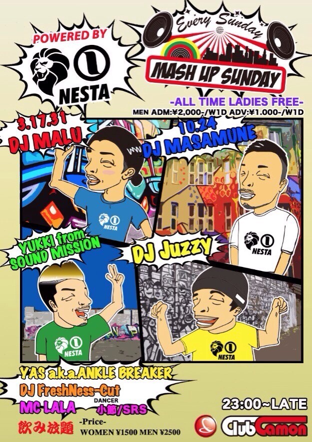 【毎週日曜マショップサンデー】日曜カモンはHIP HOP®GAE PARTY『MASH UP SUNDAY』 Powered By NESTA BRAND★★女性は終日入場無料☆☆CLUB CAMONのLINE公式アカウント登録で割引特典あり☆☆お得な終日飲み放題プランもあります★★