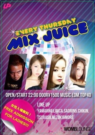 Every Thursday at WOMB LOUNGE is restarted as MIX JUICE! As the title MIX JUICE suggests, from the latest EDM and Top 40 to danceable house music, it's an all-night MIX!!! We want everyone from edgy young DJs to regular veterans to experience one GROOVY night!