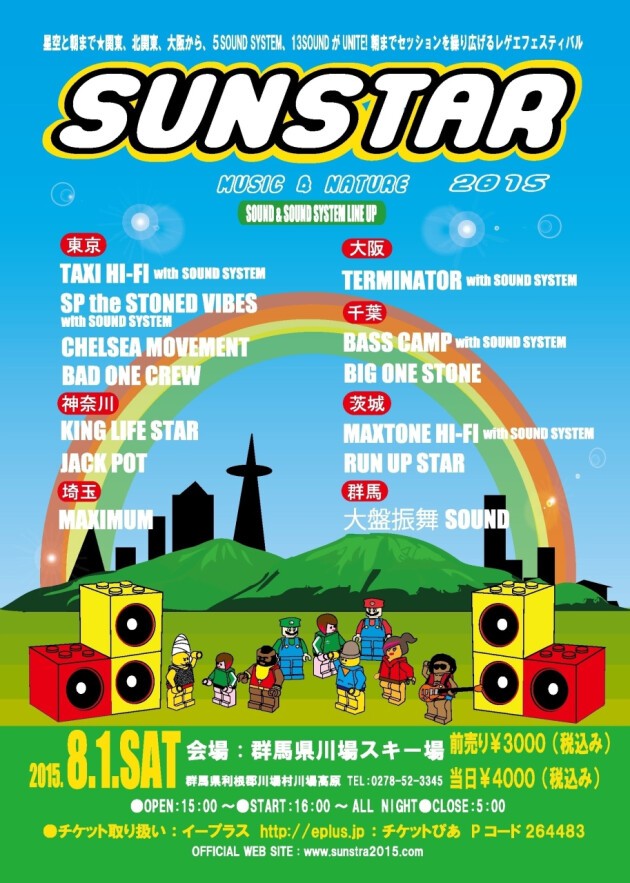 「星空の下...朝まで★」関東、北関東、大阪から5サウンドシステム、10以上のサウンドが集合。メインエリア、サブエリア2会場で繰り広げられる、関東最大規模のレゲエ野外ダンス、オールナイトで今年も開催!