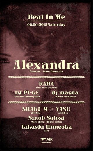 現在世界中から大きな注目を集めているルーマニア・ダンスミュージックシーンの最前線を紹介していく“Beat In Me”が、初めてのフィメールDJをフィーチュアすることとなった。今回が初来日となるAlexandraは、女性らしい繊細かつパワフルな音楽性で現地のクラウドを歓喜させている新星アーティストだ。さらにメインフロアには、レジデントのRAHAとPI-GEに加え、以前からこのパーティで待望されていた国内トップDJ Masdaが登場。またラウンジでは、人気パーティ“ARTEMIS”の主宰であり、安定したグルーヴに定評のあるSHAKE M×YASUの2人が刺激的なB2Bセットを繰り広げる。非常に見応えのある音空間が、そこに。