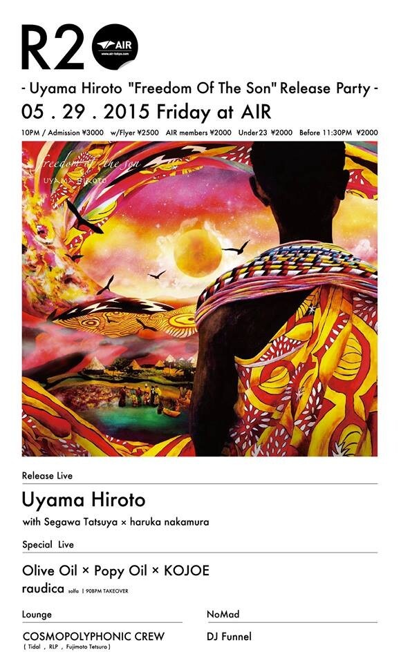 2010年に逝去した伝説のヒップホップアーティストnujabesと、彼のレーベルhydeout productionsを支えてきたUyama Hirotoが、"roph recordings"を立ち上げオリジナリティの高い音楽性で世界的な評価を受けた「a son of the sun」以来6年ぶりとなるセカンドアルバム「freedom of the son」を引っ提げてAIRに初登場。記念すべきリリースパーティで、Segawa Tatsuya、haruka nakamuraとともに渾身のライヴセットを披露する。さらにOlive Oil 、Popy Oil、KojoeもAIR初参戦を果たし、エキサイティングなパフォーマンスでオーディエンスを挑発していく予定だ。ラウンジやNoMadにも多くのアーティストが集結し、素晴らしい新作の誕生を祝福するプレミアムな夜を見逃すな。