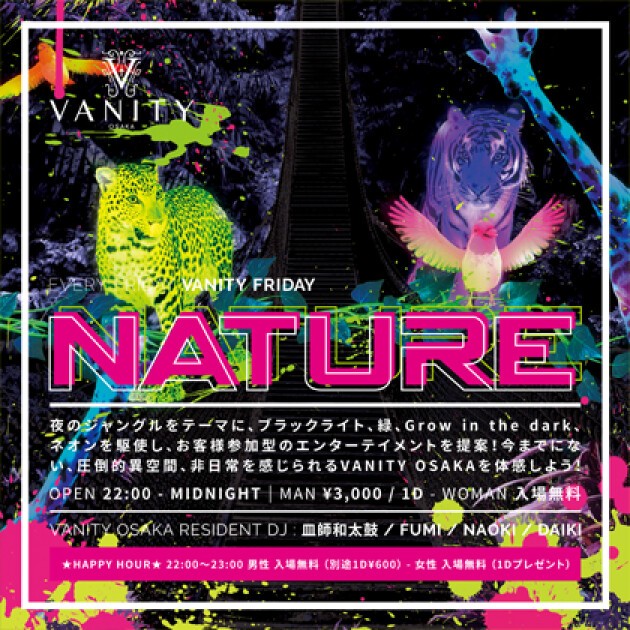 夜のジャングルをテーマに、ブラックライト、緑、Grow in the dark、ネオンを駆使し、お客様参加型のエンターテイメントを提案!今までにない、圧倒的異空間、非日常を感じられるVANITY OSAKAを体感しよう!