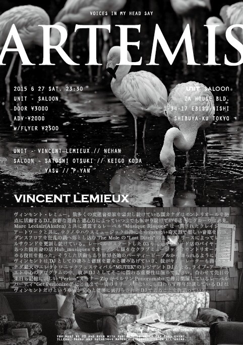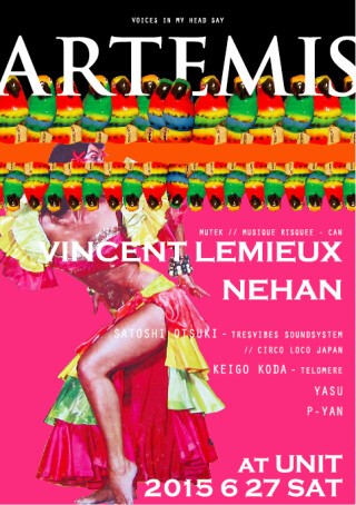 これまでに、Jan Kruger、Lowtecなどの海外勢からRYOSUKE&KABUTOなど国内のDJまで、辣腕なゲスト陣と共に、タフなパーティと芳醇な音楽を追求してきたARTEMIS。今回のゲストDJは、欧米でも有数のエレクトロニックミュージックの祭典 ''MUTEK”を主催し、レーベル”Musique Risquee”を運営するVincent Lemiuxがラブコールに応えて再登場!