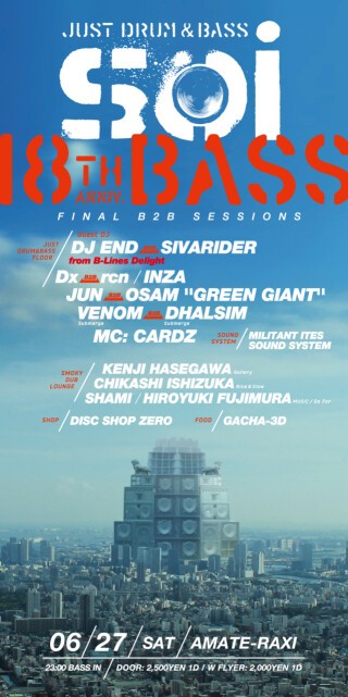 例年より一足早い今年のSoiのアニバーサリーは、Soiでは非常にレアなB2B SPECIAL!Soiクルー2組に加え、栃木の低音テロリスト集団BLDからDJ END & SIVARIDER、若き精鋭コンビSubmergeからVENOM & DHALSIMがB2Bによる低音錬金術を披露する。いざっ、ラストSoi at AMATE-RAXI!