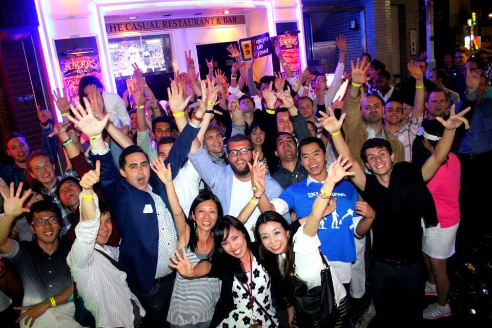 The Tokyo Pub Crawl is a “bar tour” or “bar hopping”. Anyone can join, and most people come alone. Participants meet at the starting bar, and visit 3 or 4 other bars together. We walk from bar to bar in one large group. It’s a great opportunity to meet people, have fun with friends, and see Tokyo nightlife. Expect about 70 - 100 people, both Japanese and non-Japanese. Get ready to party!