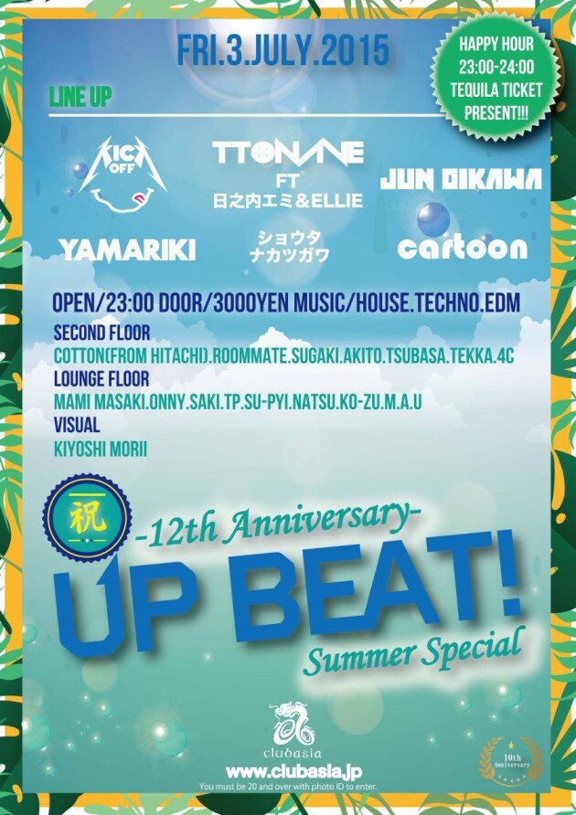 今年12年目を迎えるロングランパーティーUP BEAT!が約2年の歳月を超えて古巣Club asiaに凱旋する。10周年を迎え円熟期にも関わらず700名以上を動員する不動のUpper House Music party 『UP BEAT!』