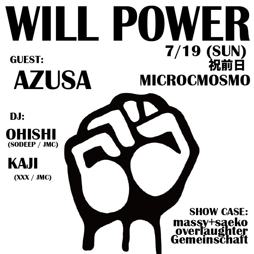 新たなパーティ"WILL POWER"はまさに次のBreakthroughアーティストが、毎回ゲストで登場する。今回は女性DJのパイオニアであり、偉大なキャリアに裏打ちさ れたスキルは多くのアーティストに認められているDJ AZUSAが登場する。期待の高まるこのパーティは注目したい。