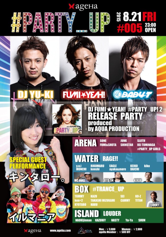MIX CDセールスが100万枚を突破する若き才能DJ FUMI★YEAH!、渋谷人気クラブでもレジデントを務めるDJ YU-KI、electroxやELECTRIC RUNなどの出演で脚光をあびるDJ BABY-T。若き三羽烏と彼らの所属するAQUA PRODUCTIONが満を持してお送りするスーパーパーティー!