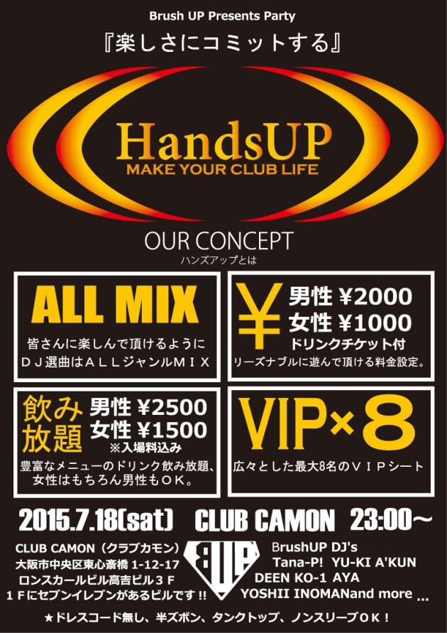 【HandsUP】7/18(土)☆今話題の『コミットする』パーティー『HandsUP』★★ALLジャンルMIXに飲み放題プランで楽しさにコミットします☆☆CLUB CAMONのLINE公式アカウント登録で割引特典あり★★