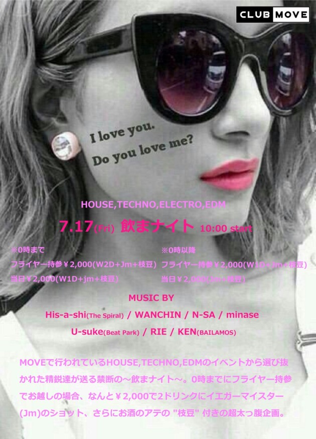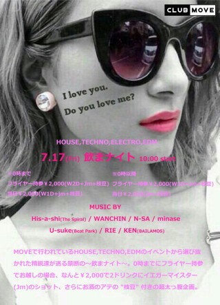 MOVEで行われているHOUSE,TECHNO,EDMのイベントから選び抜かれた精鋭達が送る禁断の~飲まナイト~。