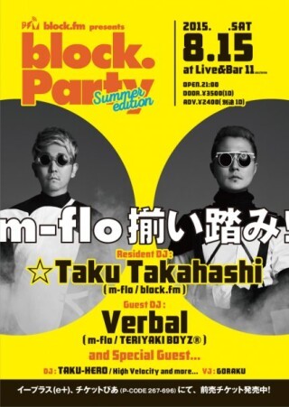 日本発のダンスミュージック専門インターネットラジオ『Block.FM』のオフィシャルパーティー「Block Party」 レジデントを務める☆TAKU TAKAHASHI、そして今回は、ゲストにVerbalが登場!m-flo揃い踏み!
