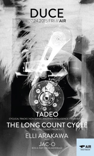 進化し続けるスペインのアンダーグラウンド・テクノ・シーンのベテランTadeoと、N.Y.から謎に包まれた注目のデュオThe Long Count CycleがELLI ARAKAWA主宰"DUCE"にて交える