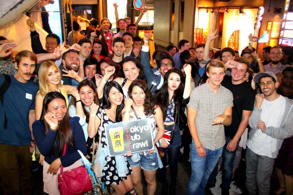 The Tokyo Pub Crawl is a “bar tour” or “bar hopping”. Anyone can join, and most people come alone. Participants meet at the starting bar, and visit 3 or 4 other bars together. We walk from bar to bar in one large group. It’s a great opportunity to meet people, have fun with friends, and see Tokyo nightlife. Expect about 70 - 100 people, both Japanese and non-Japanese. Get ready to party!