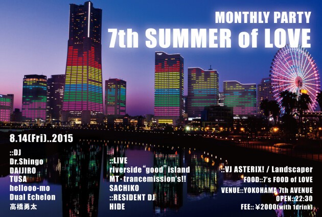 ちょうどYOKOHAMA 7th AVENUEがオープンした30年前に、遠く離れたイギリスではその後のダンスシーンに多くの影響をもたらした一つのムーヴメントが巻き起こった。それが 「The second Summer of Love」だ。それは首都ロンドンではなく、マンチェスターやリバプールなどの工業地帯が流行の中心だった。東京ではなく、横浜であるかのように...。 横浜にダンスミュージックムーヴメントを!2015年4月より「7th SUMMER of LOVE」マンスリー開催中!