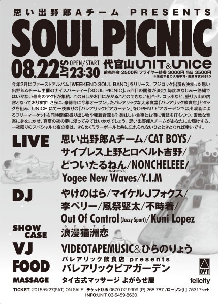 今年2月にファーストアルバム「WEEKEND SOUL BAND」をリリース、 フジロック出演も決まった思い出野郎Aチーム主催のナイスパーティー「SOUL PICNIC」、5回目の開催が決定! 毎度おなじみ一筋縄ではいかない最高のアクトが集結、 この日しかお目にかかることのできない組合せ、コラボなど、盛り沢山の内容となっております! さらに、豪徳寺に今年オープンしたバレアリックな大衆食堂「バレアリック飲食店」とタッグを組み、 UNICE にて一夜限りの「バレアリックビアガーデン」をOPEN! ビアガーデンでは出演者によるフリーマーケットも同時開催!掘り出し物や秘蔵音源も? 美味しい食事とお酒に舌鼓を打ちつつ、素敵な音楽に身をまかせ、真夏の夜の夢に浸ってみてはいかがでしょう。 思い出野郎Aチームがあなたにお届けする、一夜限りのスペシャルな夜の宴は、 きらめくミラーボールと共に忘れられないひとときとなれば幸いです。