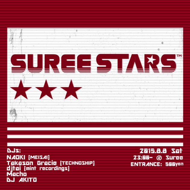 恵比寿は明治通り沿いの隠れ家的DJ BAR "Suree"の看板パーティ『SUREE STARS』。 2ヶ月ぶりの出演となるNAOKI (迷彩)を中心に、今回もコダワリのメンバーをラインナップ!