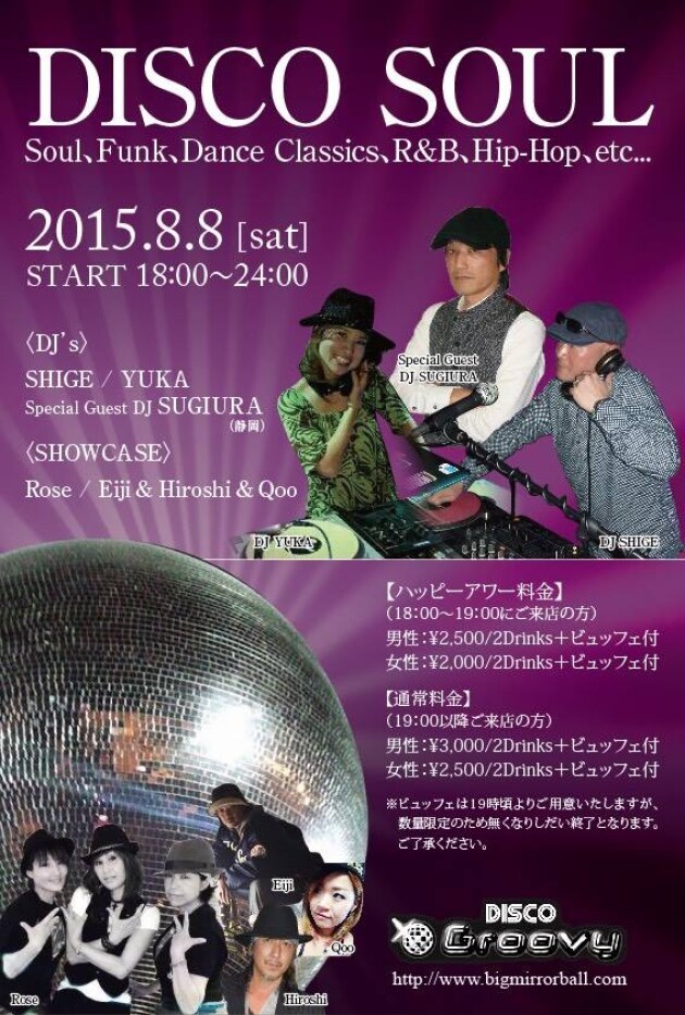 8月第2土曜日は【DJ SHIGE&DJ YUKA】にておなじみ、黒音中心の夜に静岡より今回3回目となるDJ SUGIURA をゲストに迎えさらに黒くお届けします。