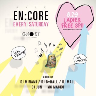 毎週土曜日のGHOSTは大阪のクラブシーンを常に最先端へ引っ張って来たDJ陣を揃え、HIP HOPをベースに"今一番クラブで盛り上がる曲"をオープンフォーマットスタイルでお届けする『EN:CORE』!HIP HOP好きのアナタはもちろん、海外のクラブシーンを追いかけるSoundCloud中毒のアナタもきっと満足できる、唯一無二の内容でアメ村の土曜日の夜を彩ります。