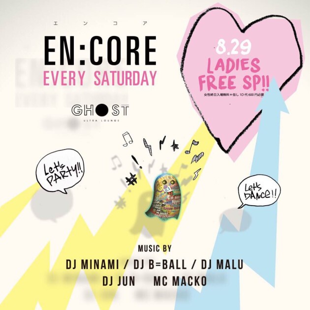 8/29の毎週土曜EN:COREサマースペシャルは、初のレディースフリーを実施♫女性の皆さんは入場無料と大変お得になります!まだ夏を満喫してない貴女、この機会に是非。