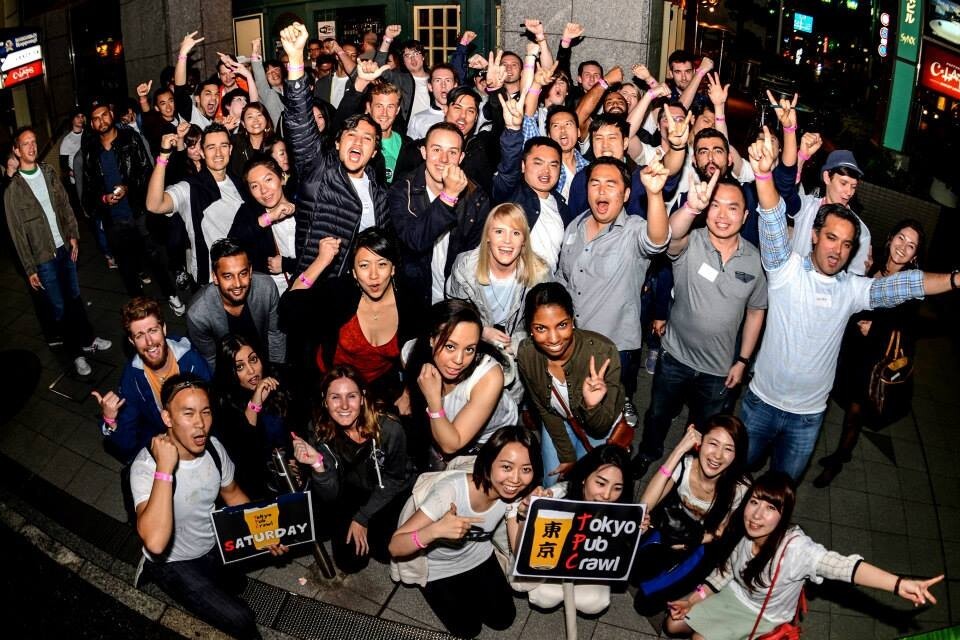 The Tokyo Pub Crawl is a “bar tour” or “bar hopping”. Anyone can join, and most people come alone. Participants meet at the starting bar, and visit 3 or 4 other bars together. We walk from bar to bar in one large group. It’s a great opportunity to meet people, have fun with friends, and see Tokyo nightlife. Expect about 70 - 100 people, both Japanese and non-Japanese. Get ready to party!