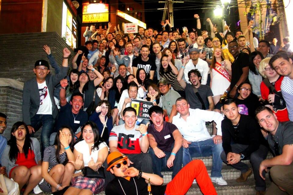 The Tokyo Pub Crawl is a “bar tour” or “bar hopping”. Anyone can join, and most people come alone. Participants meet at the starting bar, and visit 3 or 4 other bars together. We walk from bar to bar in one large group. It’s a great opportunity to meet people, have fun with friends, and see Tokyo nightlife. Expect about 70 - 100 people, both Japanese and non-Japanese. Get ready to party!