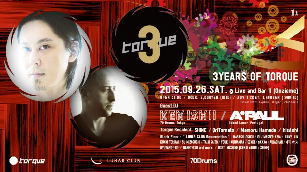 日本/環太平洋からワールドワイドにシーンを活性化させるべく立ち上がった国産テクノレーベル【Torque】が3周年を迎える。その記念すべきレーベルショーケースに、日本を代表するテクノゴッド・ケンイシイがゲスト出演する。また、世界でも有数の音圧と力強さを誇るテクノレーベル・Naked Lunchの中心人物であり世界を沸かせ続けるA.PAULもポルトガルより特別出演!Black Floorでは、大阪のテクノシーンに一石を投じたLUNAR CLUBが総勢15名以上のDJと共に約四年ぶりに一夜限りの復活!トルクでしか成し得ない、日本一パワフルなこの夜を決して見逃すな!
