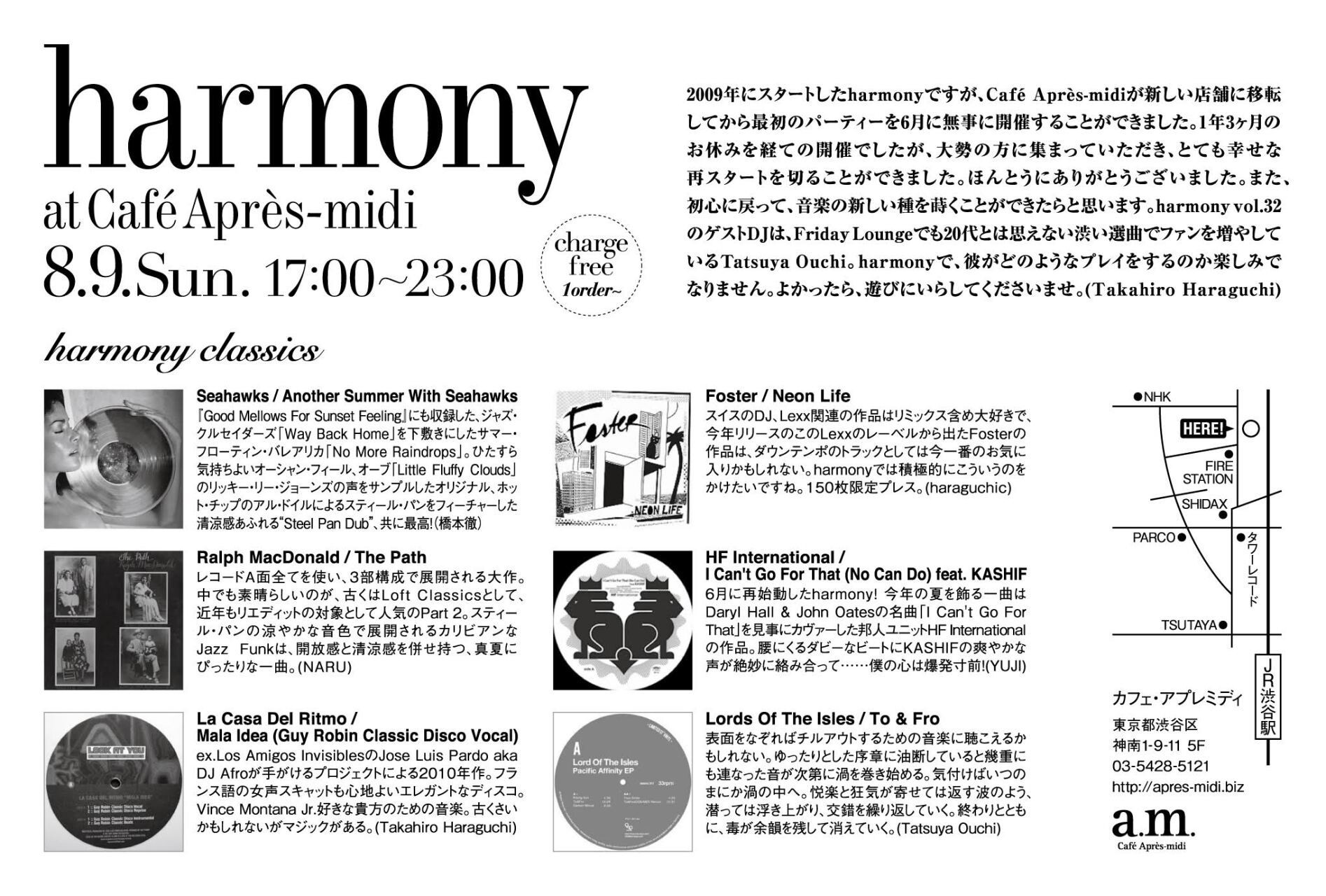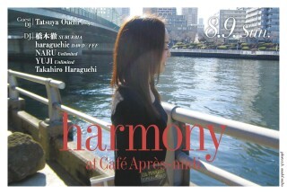 2009年にスタートしたharmonyですが、Cafe Apres-midiが新しい店舗に移転してから最初のパーティーを6月に無事に開催することができました。1年3ヶ月のお休みを経ての開催でしたが、大勢の方に集まっていただき、とても幸せな再スタートを切ることができました。ほんとうにありがとうございました。また、初心に戻って、音楽の新しい種を蒔くことができたらと思います。harmony vol.32のゲストDJは、Friday Loungeでも20代とは思えない渋い選曲でファンを増やしているTatsuya Ouchi。harmonyで、彼がどのようなプレイをするのか楽しみでなりません。よかったら、遊びにいらしてくださいませ。(Takahiro Haraguchi)